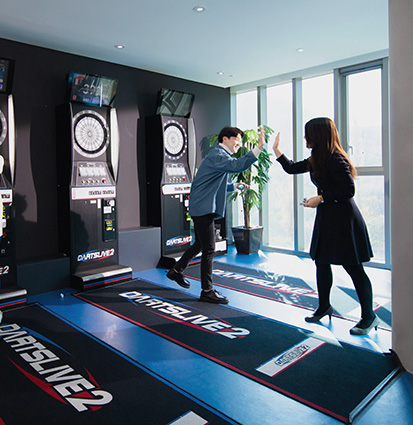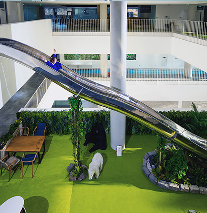 헬스장과 미용실, 요가실, 수용장, 3층에서 2층으로 연결된 대형 미끄럼틀, 책상이 없는 회의실(트램폴린, 농구장, 볼풀장), 누구나 참여할 수 있는 미니 게임(다트, 테이블 풋볼, 테이블 에어 하키), 영감과 재미를 주는 회의실(변기, 캠핑장, 골프, 그네) 등 언제 어디서나 놀면서 일할 수 있습니다.