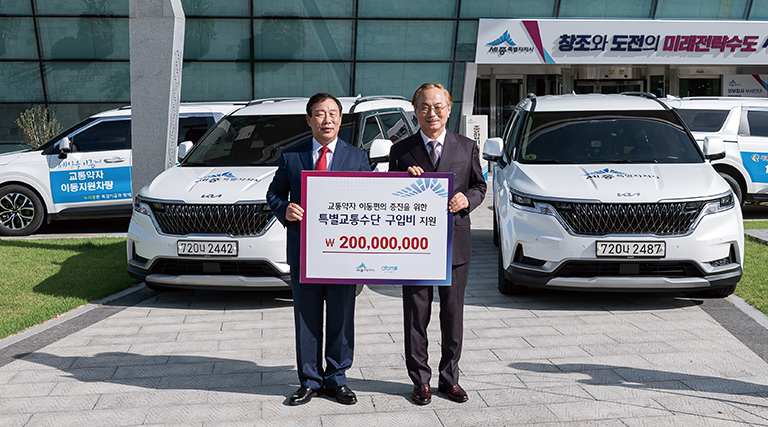 交通弱者の移動権保障のための公共インフラ拡充に貢献するため、2022年に世宗市へ障害者コールタクシー購入費として2億ウォンを寄付しました。この寄付金は、車椅子での乗車が可能な特別交通手段4台の購入に使用される予定であり、世宗市の法定普及率全国1位の早期達成にも貢献しています。障害者や高齢者など、移動が不便な市民の社会参加拡大と日常生活のアクセス性改善に実質的な助けとなる事例として、企業の社会的責任を地域社会の交通福祉向上に結びつけた代表的な事例です。