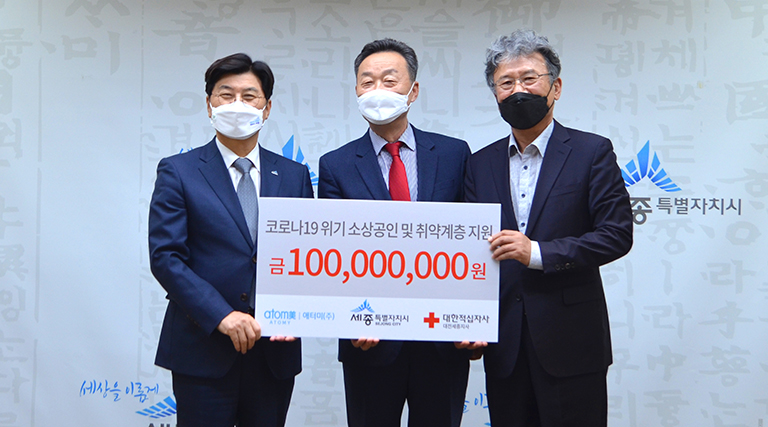 Aufgrund der anhaltenden COVID-19-Pandemie haben wenig sichtbare gefährdete Gruppen noch mehr Schwierigkeiten, und auch Kleinunternehmer kämpfen aufgrund von Umsatzeinbußen mit wirtschaftlichen Problemen. Im Jahr 2021 entwickelte Atomy in Zusammenarbeit mit dem Koreanischen Roten Kreuz ein Win-Win-Spendenprojekt, das einerseits Kleinunternehmern durch den Kauf von Lebensmitteln auf dem Sanseong-Markt in Gongju unterstützte, und andererseits Bedürftige, an die die Lebensmittel in Form von Lunchpaketen verteilt wurden. So konnte nicht nur den Kleinunternehmern, sondern auch den Bedürftigen geholfen werden.