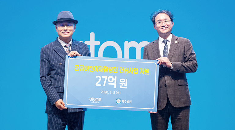 - Im Jahr 2020 spendeten wir 2,7 Mrd. KRW für den Bau eines öffentlichen Rehabilitationskrankenhauses für Kinder, ein nationales Projekt, gefördert vom Presbyterianischen medizischen Zentrum in Jeonju. Während sich die meisten Rehabilitationskliniken auf die Behandlung von Unfallfolgen konzentrieren, brauchen Kinder spezialisiertere Kliniken und medizinisches Personal, da sie neben der körperlichen Behandlung auch professionelle Hilfe bei psychologischen und mentalen Problemen benötigen. Allerdings gibt es in Korea keine öffentlichen Rehabilitationskliniken für Kinder, was auf die geringe Fallzahl zurückzuführen ist. Wir hoffen, dass der kleine Beitrag von Atomy die Wiederbelebung von Rehabilitationskliniken für Kinder unterstützen wird.