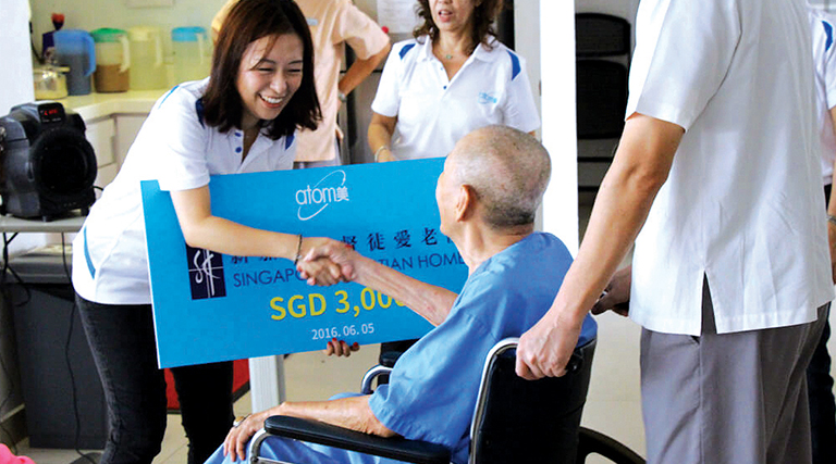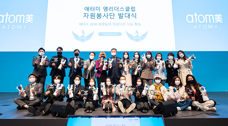 Von den Atomy Mitgliedern leisten etwa 100 Young Leaders und 20 Mitarbeiter zwischen 20 und 30 Jahren ehrenamtliche Arbeit in acht Regionen des Landes sowie dem Headquarter von Atomy. Sie leisten Freiwilligenarbeit wie Strandsäuberungen, den Austausch von Leuchtstoffröhren zur Verbesserung des Lebensumfelds bedürftiger Menschen und das Anbringen von Insektennetzen und haben in den Jahren 2021 und 2022 Produkte für bedürftige Menschen im Wert von 16,46 Mio. KRW bzw. 117,45 Mio. KRW gespendet.